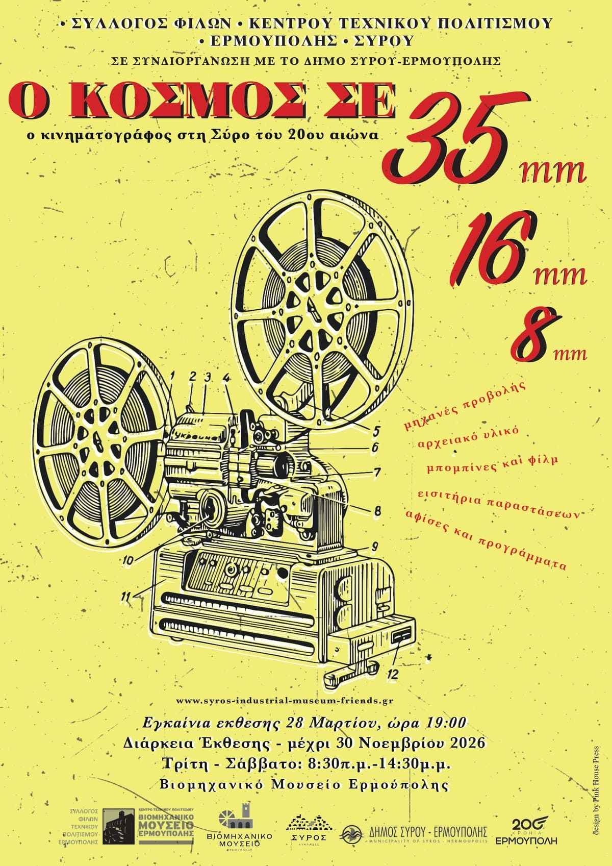 Ο Δήμος Σύρου-Ερμούπολης, σε συνεργασία με τον Σύλλογο Φίλων του Κέντρου Τεχνικού Πολιτισμού (ΚΕΤΕΠΟ), σας προσκαλούν στα εγκαίνια της έκθεσης «Ο κόσμος σε 35, 16, 8 mm… Ο κινηματογράφος στη Σύρο του 20ού αιώνα», το Σάββατο 28 Μαρτίου 2026 και ώρα 19:00, στην αίθουσα περιοδικών εκθέσεων του Βιομηχανικού Μουσείου.